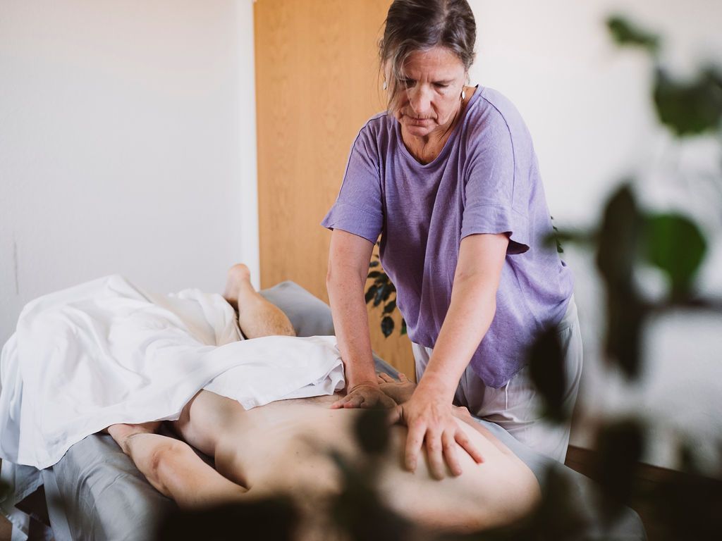 Eine Massage-Session mit Schwerpunkt auf Dehnungen und sanften Schaukelbewegungen.
